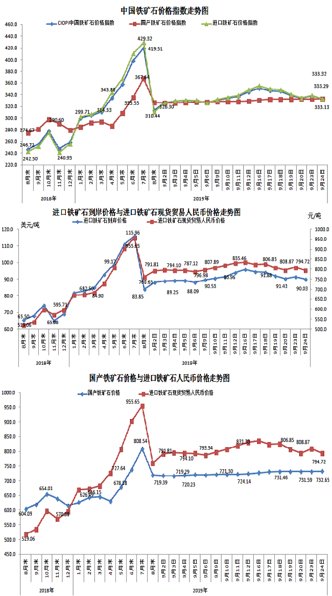 9月24日,中國鐵礦石價格指數(CIOPI)333.29點,環比下降4.28點,降幅為1.27%。其中:國產鐵礦石價格指數為333.13點,環比上升0.48點,升幅為0.15%;進口鐵礦石價格指數為333.32點,環比下降5.18點,降幅為1.53%。