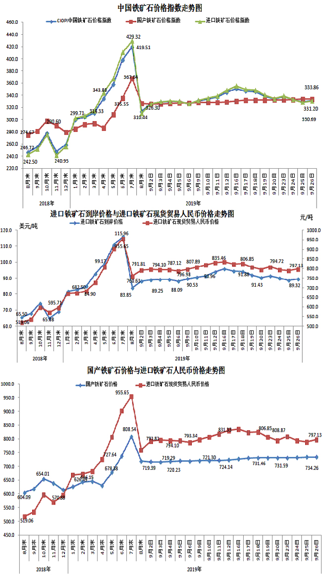 9月26日,中國鐵礦石價格指數(CIOPI)331.20點,環比上升2.04點,升幅為0.62%。其中:國產鐵礦石價格指數為333.86點,環比上升0.09點,升幅為0.03%;進口鐵礦石價格指數為330.69點,環比上升2.41點,降幅為0.73%。