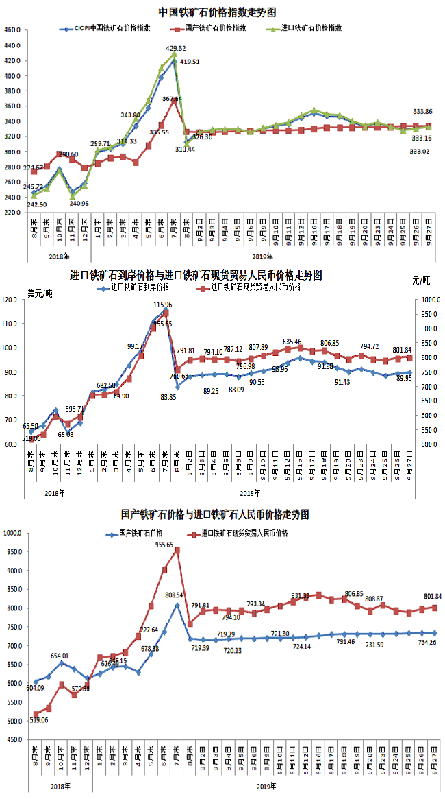 9月27日,中國鐵礦石價格指數(CIOPI)333.16點,環比上升1.96點,升幅為0.59%。其中:國產鐵礦石價格指數為333.86點,環比持平;進口鐵礦石價格指數為333.02點,環比上升2.33點,降幅為0.71%。