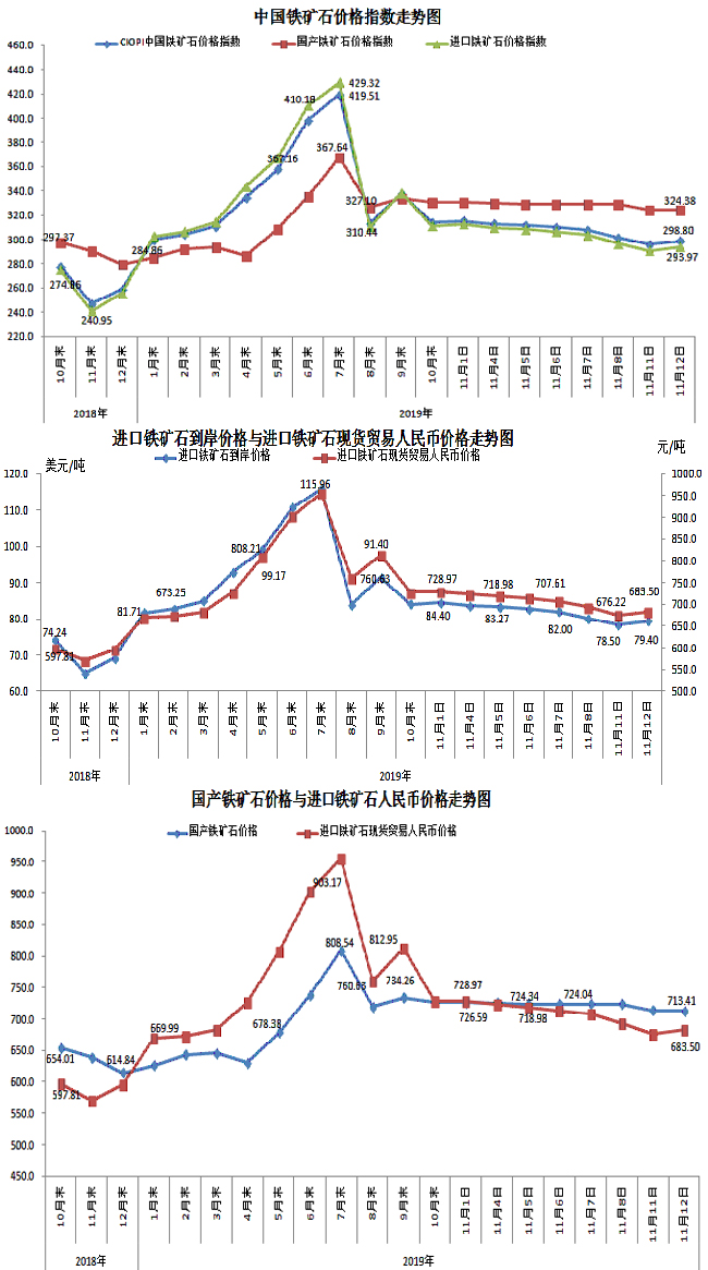 11月12日,中國鐵礦石價格指數(CIOPI)298.80點,環比上升2.78點,升幅為0.94%。其中:國產鐵礦石價格指數為324.38點,環比下降0.13點,降幅為0.04%;進口鐵礦石價格指數為293.97點,環比上升3.33點,升幅為1.15%。