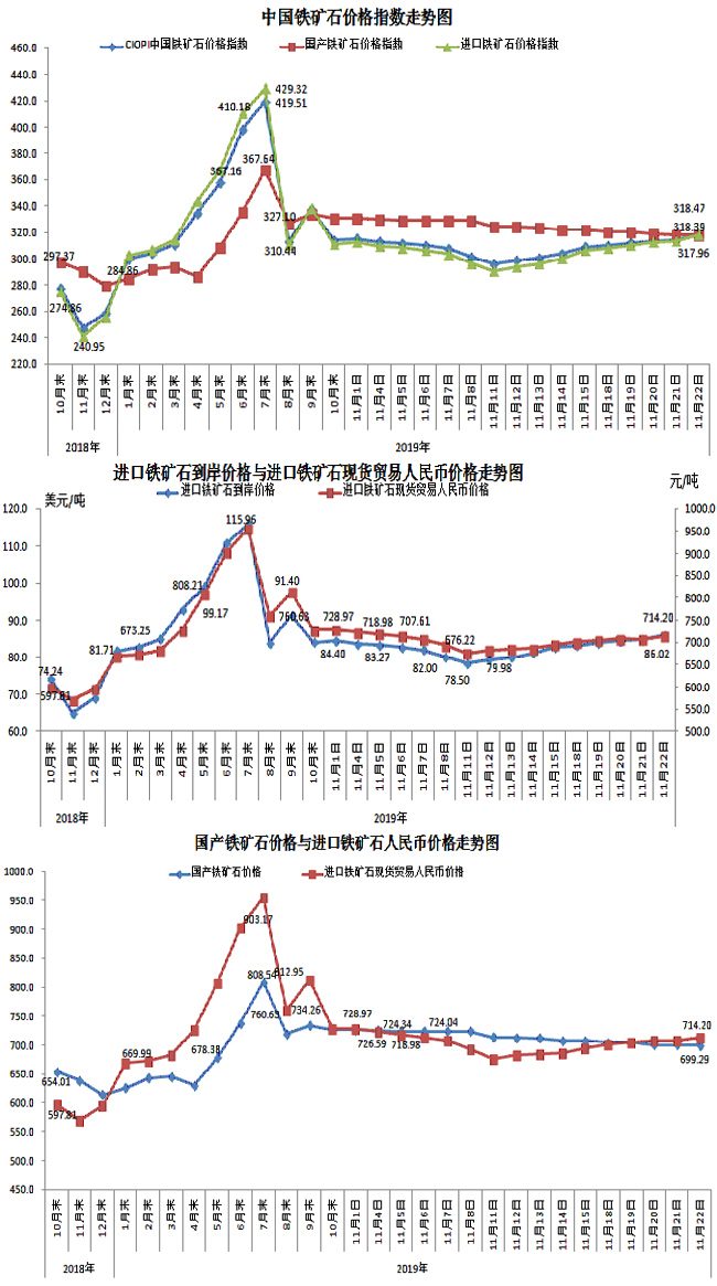 11月22日,中國鐵礦石價格指數(CIOPI)318.39點,環比上升4.00點,升幅為1.27%。其中:國產鐵礦石價格指數為317.96點,環比下降0.47點,降幅為0.15%;進口鐵礦石價格指數為318.47點,環比上升4.85點,升幅為1.55%。