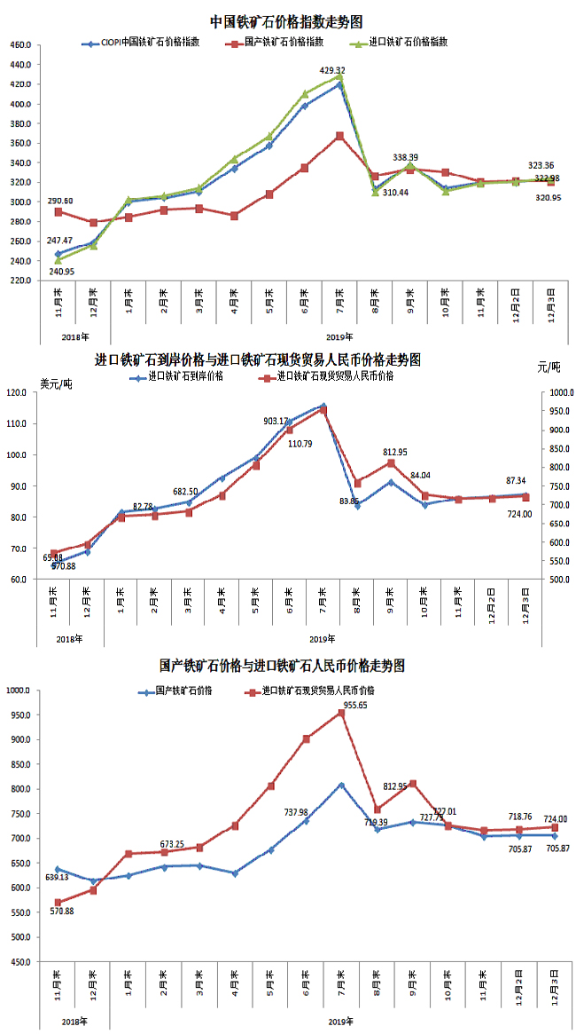12月3日,中國鐵礦石價格指數(CIOPI)322.98點,環比上升2.55點,升幅為0.80%。其中:國產鐵礦石價格指數為320.95點,環比持平;進口鐵礦石價格指數為323.36點,環比上升3.04點,升幅為0.95%。