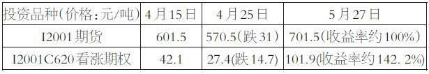 從實際行情來看,鐵礦石價格在4月整體處於振蕩狀態,直至5月中旬價格才進入了明顯的上漲行情。若投資者於4月15日入場,選擇較為中長期的2001合約,假設當時鐵礦石期權已經上市,理論上買入一手I2001期貨與買入一手I2001C620看漲期權的運行情況對比如下(以收盤價、曆史波動率作為期權理論價格計算依據):