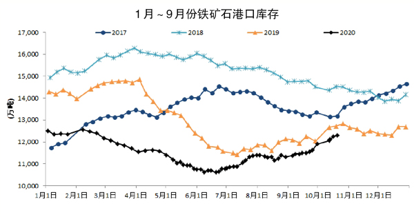 中秋、國慶“雙節”前,受鋼廠階段性補庫存、唐山市鋼廠環保限產對高爐實際生產影響較小等因素影響,鐵礦石期貨出現較大幅度反彈。“雙節”後,隨著鋼廠補庫存熱潮退去,盤麵向供應寬鬆格局回歸。