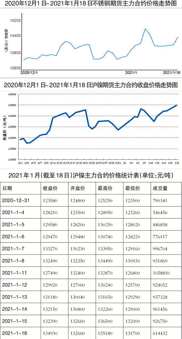 本周一(1月18日),滬鎳期貨價格震蕩上升,幅度很大。至當天下午3時,滬鎳主力合約收盤價、最高價及最低價分別達到134930元/噸、135180元/噸和131700元/噸,成交614432手。其中,收盤價較前一交易日結算價增加670元/噸(上漲0.50%)。鎳2104、鎳2105及鎳2102的收盤價分別為134850元/噸(上漲0.57%)、134780元/噸(上漲0.70%)和134820元/噸(上漲0.39%)。