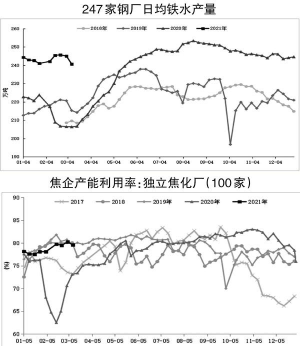 近期,黑色金屬板塊五大品種走勢分化,整體呈成材強、原材料弱格局,其中焦炭期、現貨價格均處於下跌走勢,成為原材料中最弱的品種。上周(3月8日~3月12日),焦炭期貨主力合約J2105價格延續震蕩偏弱走勢,價格跌至2240元/噸附近,創近期新低。從周度K線圖上看,焦價已連續3周收短腳陰線,降幅約500元/噸,暫未有明顯企穩跡象。