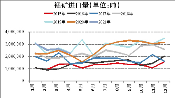 錳矽的主要成本在錳礦。2021年1月~4月份,我國錳礦進口量為1046萬噸,同比增長15.7%,增幅有所減小。其中,4月份錳礦進口量為224.7萬噸,高於2020年同期水平,但低於2019年同期。主要原因在於2021年2月份後錳礦進口利潤轉負,錳礦在4月進口量預計維持偏低位置,預計5月進口量也偏低。2021年4月,全國錳矽累計產量為91.1萬噸,環比增長2.11%,同比增長10.2%。錳矽4月份產量增長還是比較快的,主要原因在於3月、4月份利潤較好,內蒙古部分地區的限產對錳矽影響沒有矽鐵大。從短周期的錳矽數據來看,錳矽的開工率從60%緩慢上升至65%左右。目前政策對錳矽產量的影響有兩點:一是直接限電,導致減產;二是電費政策,內蒙古對列入限製類的產能提高電費。預期錳矽在產產能為57.41萬噸,這直接提升了錳矽的生產成本線。5月以後北方錳利潤出現了一定回落,南方略有回升。