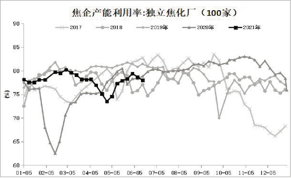 具體來看,供應方麵,目前樣本焦企平均噸焦盈利保持在800元(yuan)以(yi)上(shang),盈(ying)利(li)良(liang)好(hao)支(zhi)撐(cheng)焦(jiao)企(qi)保(bao)持(chi)較(jiao)高(gao)的(de)生(sheng)產(chan)積(ji)極(ji)性(xing),但(dan)華(hua)北(bei)地(di)區(qu)環(huan)保(bao)限(xian)產(chan)政(zheng)策(ce)趨(qu)嚴(yan),焦(jiao)化(hua)產(chan)能(neng)利(li)用(yong)率(lv)持(chi)續(xu)下(xia)降(jiang),焦(jiao)炭(tan)供(gong)應(ying)邊(bian)際(ji)回(hui)落(luo)。上(shang)周(zhou),100家獨立焦企產能利用率為77.98%,環比下降0.7個百分點,同比上升0.82個百分點。