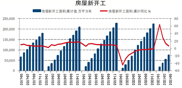 從鋼材需求來說,黑色產業鏈的下遊為經濟生活的各個方麵,主要是房地產、基建以及機械、汽車、家電等行業。這些行業經曆了新冠肺炎疫情衝擊之後,均有過複蘇期,但各項數據在4月、5月環比均有所回落。根據國家統計局數據,2021年1月~5月份,全國房屋新開工麵積為74348萬平方米,同比增長6.9%。5月新開工麵積增速大幅下降,單月開工20444萬平方米,單月值低於2019年及2020年同期水平。根據國家統計局數據,2021年1月~5月份,我國金屬切削機床產量為25萬台,同比增長48.8%。今年5月份產量為4萬台,而2020年同期為4.2萬台,2019年同期為4.6萬台。金屬切削機床是機械行業用鋼的領先指標。根據國家統計局數據,2021年1月~5月份,全國汽車產量為1075萬輛,同比增長38.4%,也超過2019年、2020年同期水平,但不及2018年同期。從家電的累計同比增速來看,家電業產量增速也有所放緩。根據國家統計局數據,2021年5月,我國空調產量為2205.8萬台,同比增長14.0%;5月冰箱產量為748.7萬台,同比下降4.2%;5月洗衣機產量為703.2萬台,同比增長12.1%;5月彩電產量為1442.9萬台,同比下降3.2%。1月~5月份我國空調累計產量為10175.9萬台,同比增長33.4%;1月~5月份冰箱累計產量為3711.6萬台,同比增長29.2%;1月~5月份洗衣機累計產量為3618.4萬台,同比增長37.3%;1月~5月份彩電累計產量為7282.9萬台,同比增長10.2%。國家統計局數據,2021年1月~5月份民用鋼船同比增長21.4%至1295.7萬載重噸,但是不及2019年同期1433萬載重噸。