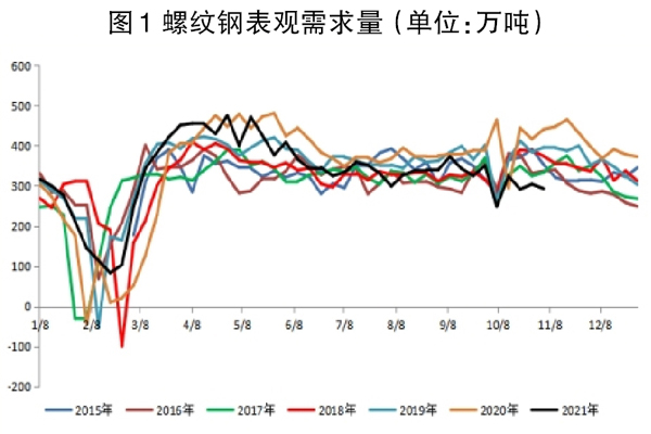 截至11月4日當周,螺紋鋼表觀需求量為292.85萬噸,環比下降10.95萬噸,同比下降147.53萬噸。該數值無論與今年過往數據(剔除春節前後),還是往年同期數據相比,都屬於偏低水平。在“金九銀十”褪色後,隨著天氣轉冷,11月份、12月份螺紋鋼需求量難有較好表現,價格承壓。
