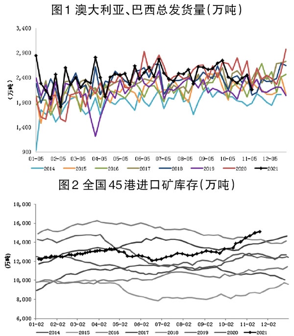 gongyingfangmian,zhuliukuangshanfayunzhengtichuxianhuiluo,tongshidaogangliangchixuxiajiangdaozhijinkoukuangshijigonggeijianshao,fuhegonggeiduanzaitiekuangshijiagedafuxiadiehouchuxianyidingchengduxiajiangdeyuqi。shujuxianshi,11月8日~14日,澳大利亞、巴西鐵礦石發運總量為2155.9萬噸,周環比減少293.5萬噸。其中,澳大利亞鐵礦石發運量為1547.4萬噸,周環比減少270.1萬噸;巴西發運量為608.5萬噸,周環比減少23.4萬噸。11月8日~14日,中國45港到港總量為2354.1萬噸,周環比減少65.7萬噸;北方6港到港總量為1176.7萬噸,周環比減少70.9萬噸。