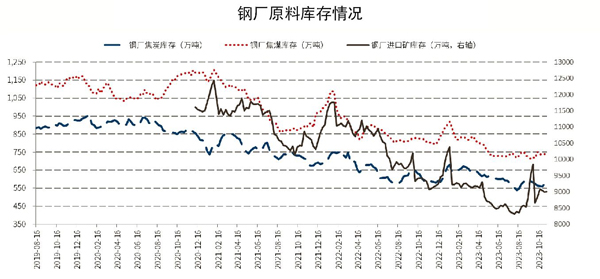 鋼(gang)材(cai)庫(ku)存(cun)同(tong)比(bi)呈(cheng)現(xian)基(ji)本(ben)持(chi)平(ping)狀(zhuang)態(tai),供(gong)需(xu)基(ji)本(ben)平(ping)衡(heng),鋼(gang)材(cai)市(shi)場(chang)亦(yi)無(wu)明(ming)顯(xian)的(de)價(jia)格(ge)驅(qu)動(dong)。但(dan)鋼(gang)材(cai)產(chan)量(liang)微(wei)增(zeng),特(te)別(bie)是(shi)鐵(tie)水(shui)產(chan)量(liang)的(de)回(hui)升(sheng)帶(dai)來(lai)了(le)原(yuan)料(liao)需(xu)求(qiu)的(de)增(zeng)長(chang),導(dao)致(zhi)原(yuan)料(liao)在(zai)2023年總體呈現大幅降庫的情況。