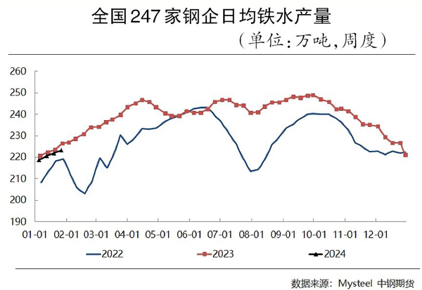 需求方麵,鋼企延續虧損狀態,需求回升緩慢。調研數據顯示,2024年1月份,全國247家樣本鋼企鐵水產量環比減少85萬噸至6886萬噸,日均鐵水產量環比下降2.8萬噸至222萬噸,降幅為1.2%。