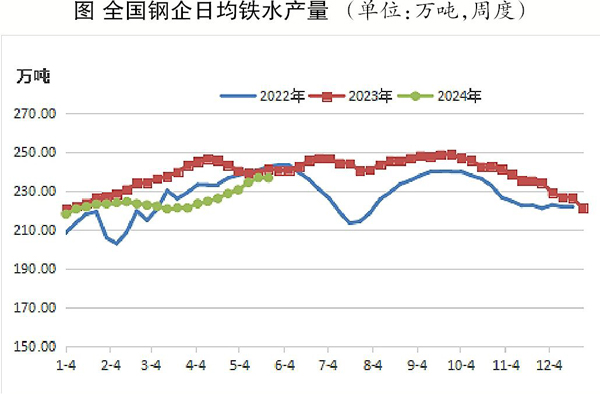 從時間點上來看,筆者的這一判斷也可以得到驗證,筆者觀察到,3月29日—4月4日,鐵水產量開始出現回升。追溯鐵礦石期貨行情的變化,可以發現,I2409合約價格是在4月1日開始反彈的。也就是說,鐵水產量變化的時間點與鐵礦石期貨價格上漲的時間點緊密對應。5月24日發布的數據顯示,日均鐵水產量從236.89萬噸回落至236.8萬噸,未能延續繼續上升的勢頭,而5月24日發布的數據實際上反映的是5月17日—5月23日的高爐生產情況。也就是說這一時期需求已經停止擴張,產業層麵的利多影響已經淡化。