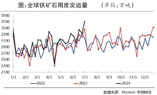 第三階段,2024年5月23日—6月底,宏觀政策處於空窗期,市場交易表現為弱現實,鐵礦石期貨、現xian貨huo價jia格ge階jie段duan性xing見jian頂ding回hui落luo,鐵tie礦kuang石shi供gong需xu保bao持chi平ping衡heng略lve寬kuan鬆song態tai勢shi,需xu求qiu邊bian際ji回hui升sheng預yu期qi偏pian弱ruo,疊die加jia宏hong觀guan政zheng策ce空kong窗chuang期qi,港gang口kou鐵tie礦kuang石shi庫ku存cun水shui平ping居ju曆li史shi同tong期qi高gao位wei,限xian製zhi鐵tie礦kuang石shi價jia格ge上shang行xing空kong間jian,鐵tie礦kuang石shi價jia格ge不bu斷duan走zou低di。