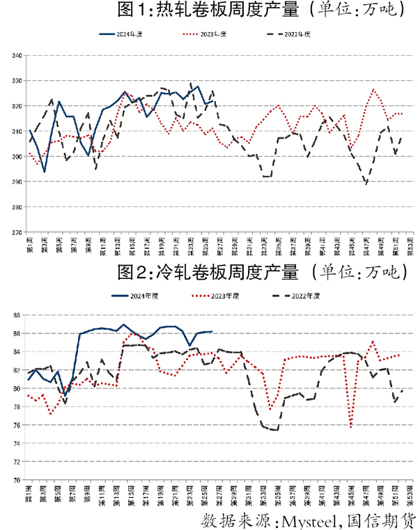 供應方麵,2024年上半年熱軋卷板供應維持在相對高位,尤其在進入5月份後,熱軋卷板周度產量一直在320萬噸以上,比2023年同期增加10萬噸左右;冷軋卷板周度產量也攀升至86萬噸左右的水平,較去年同期的82萬噸~84萬噸有所增加。