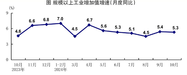 10月份,全國規模以上工業增加值同比增長5.3%,環比增長0.41%。其中,製造業增加值同比增長5.4%,裝備製造業增加值同比增長6.6%,高技術製造業增加值同比增長9.4%。分產品看,新能源汽車和工業機器人產量同比分別增長48.6%和33.4%。1月—10月份,全國規模以上工業增加值同比增長5.8%,與1月—9月份持平。10月份,製造業采購經理指數為50.1%,環比上升0.3個百分點;企業生產經營活動預期指數為54.0%,環比上升2.0個百分點。