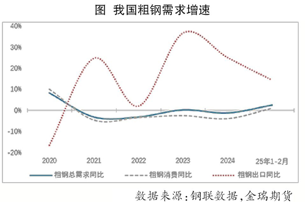 根據測算,2025年1月—2月份我國粗鋼表觀需求累計同比增長2.5%,增速由2024年全年的-1.2%轉正。其中,國內粗鋼消費累計同比增長1.0%,去年全年同比減少4.0%;粗鋼出口累計同比增長14.3%,增速較2024年回落10.7個百分點。