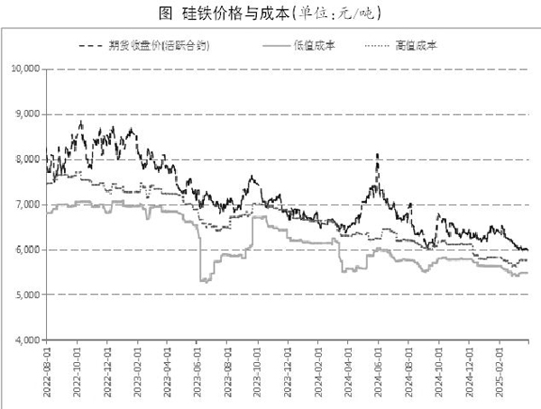 截至2025年3月31日,錳矽主力合約收盤價為6068元/噸,較2024年底的6090元/噸下跌22元/噸,其間最高價格為7412元/噸,最低價格為6008元/噸;矽鐵主力合約收盤價為5972元/噸,較2024年底的6290元/噸下跌5.0%。