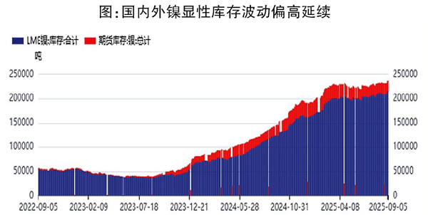 此外,海外精煉鎳庫存壓力延續。LME(倫敦金屬交易所)鎳庫存升至21萬噸附近並持續在高位運行,截至7月末,來自我國生產的精煉鎳占比超62%,絕對數量及比例波動上升。偏高的庫存情況也對鎳價上行空間形成壓製。