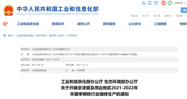 關於開展京津冀及周邊地區2021-2022年采暖季鋼鐵行業錯峰生產的通知