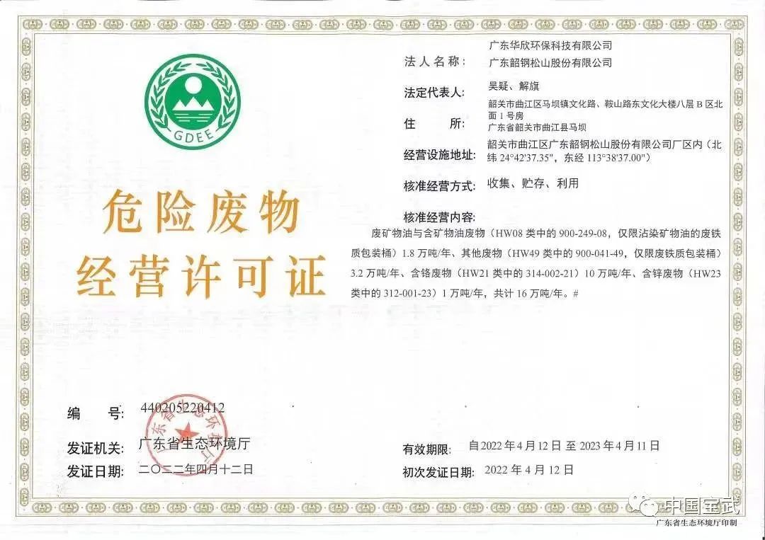 助力“無廢城市”建設!韶鋼鬆山攜手華欣環保成功獲得危險廢物經營許可證
