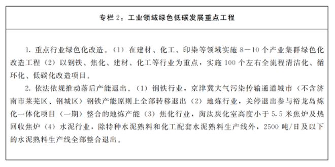 1.推(tui)動(dong)工(gong)業(ye)領(ling)域(yu)綠(lv)色(se)低(di)碳(tan)發(fa)展(zhan)。加(jia)快(kuai)退(tui)出(chu)落(luo)後(hou)產(chan)能(neng),推(tui)動(dong)傳(chuan)統(tong)產(chan)業(ye)綠(lv)色(se)化(hua)高(gao)端(duan)化(hua)發(fa)展(zhan),積(ji)極(ji)發(fa)展(zhan)綠(lv)色(se)低(di)碳(tan)新(xin)興(xing)產(chan)業(ye),建(jian)立(li)高(gao)效(xiao)綠(lv)色(se)低(di)碳(tan)的(de)現(xian)代(dai)工(gong)業(ye)體(ti)係(xi)。實(shi)施(shi)節(jie)能(neng)降(jiang)碳(tan)行(xing)動(dong),嚴(yan)格(ge)能(neng)效(xiao)約(yue)束(shu),加(jia)快(kuai)重(zhong)點(dian)領(ling)域(yu)節(jie)能(neng)降(jiang)碳(tan)步(bu)伐(fa),帶(dai)動(dong)全(quan)行(xing)業(ye)綠(lv)色(se)低(di)碳(tan)轉(zhuan)型(xing)。提(ti)高(gao)鑄(zhu)造(zao)、有色、化工等行業的園區集聚水平,深入推進園區循環化改造,著力提高工業園區綠色化水平。積極推行綠色設計、建設綠色工廠、打(da)造(zao)綠(lv)色(se)供(gong)應(ying)鏈(lian),深(shen)入(ru)推(tui)進(jin)清(qing)潔(jie)生(sheng)產(chan),加(jia)快(kuai)發(fa)展(zhan)綠(lv)色(se)工(gong)業(ye)園(yuan)區(qu)和(he)生(sheng)態(tai)工(gong)業(ye)園(yuan)區(qu)。加(jia)強(qiang)電(dian)力(li)需(xu)求(qiu)側(ce)管(guan)理(li),提(ti)升(sheng)工(gong)業(ye)電(dian)氣(qi)化(hua)水(shui)平(ping)。大(da)力(li)發(fa)展(zhan)節(jie)能(neng)環(huan)保(bao)產(chan)業(ye)。開(kai)展(zhan)全(quan)流(liu)程(cheng)二(er)氧(yang)化(hua)碳(tan)減(jian)排(pai)示(shi)範(fan)工(gong)程(cheng),推(tui)動(dong)企(qi)業(ye)設(she)備(bei)更(geng)新(xin)和(he)技(ji)術(shu)改(gai)造(zao),加(jia)快(kuai)綠(lv)色(se)低(di)碳(tan)轉(zhuan)型(xing)步(bu)伐(fa)。(責任單位:省工業和信息化廳、省發展改革委、省生態環境廳)