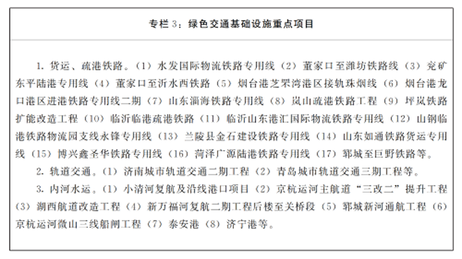 1.加快綠色交通基礎設施建設。優化交通基礎設施空間布局,加快推進港口集疏運鐵路、物流園區及大型工礦企業鐵路專用線項目建設,推動鐵路向重要貨源地延伸。統籌利用綜合運輸通道資源,鼓勵公路與鐵路、高速公路與普通公路共用線位。推進京杭運河黃河以北段適宜河段複航。加快推進綠色公路、綠色鐵路、綠色港口和綠色機場建設,提升綠色建設施工水平,推動老舊交通基礎設施升級改造,持續完善充電樁、LNG加注站、加氫站等設施。鼓勵在交通樞紐場站以及公路、鐵路等沿線合理布局光伏發電及儲能設施。推廣零碳服務區建設。(責任單位:省交通運輸廳、省發展改革委、省能源局)