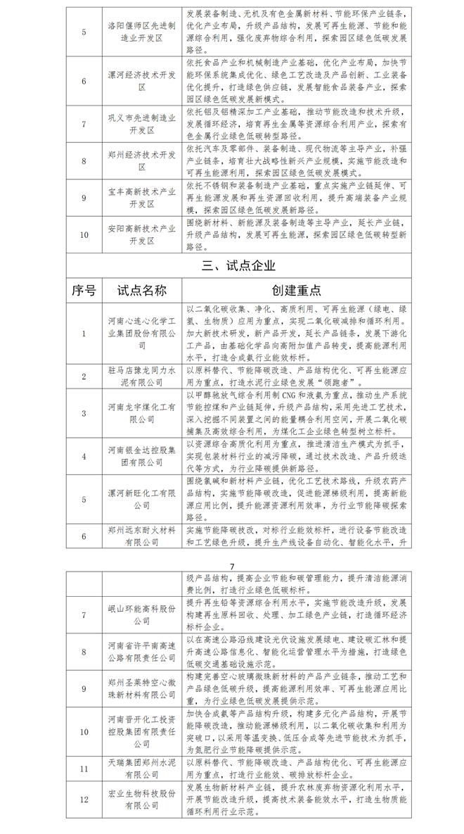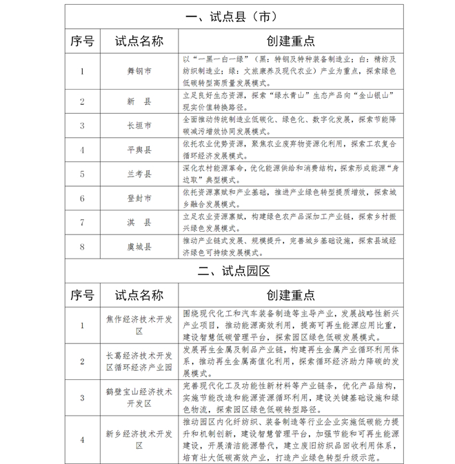為貫徹落實《中共河南省委 河南省人民政府關於印發〈河南省碳達峰實施方案〉的通知》(豫發〔2022〕29號)有關要求,根據《河南省碳達峰試點建設實施方案》(豫碳辦〔2022〕7號),經自願申報、市級推薦,省碳達峰碳中和工作領導小組辦公室會同有關單位組織第三方評估論證,報請省政府同意,確定舞鋼市等8個縣(市)、焦作經濟技術開發區等10個園區、河南心連心化學工業集團股份有限公司等12家企業為河南省碳達峰試點,建設期為2022年-2024年。現將試點名單予以公布,並就有關工作通知如下: