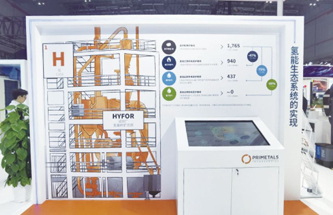 同(tong)樣(yang)展(zhan)現(xian)了(le)冶(ye)金(jin)行(xing)業(ye)低(di)碳(tan)未(wei)來(lai)的(de),還(hai)有(you)普(pu)銳(rui)特(te)冶(ye)金(jin)技(ji)術(shu)公(gong)司(si)。其(qi)展(zhan)台(tai)設(she)置(zhi)展(zhan)板(ban),對(dui)比(bi)顯(xian)示(shi)了(le)不(bu)同(tong)鋼(gang)水(shui)生(sheng)產(chan)工(gong)藝(yi)路(lu)線(xian)二(er)氧(yang)化(hua)碳(tan)的(de)排(pai)放(fang)量(liang),並(bing)演(yan)示(shi)了(le)其(qi)正(zheng)在(zai)試(shi)運(yun)行(xing)的(de)HYFOR試驗廠生產流程。