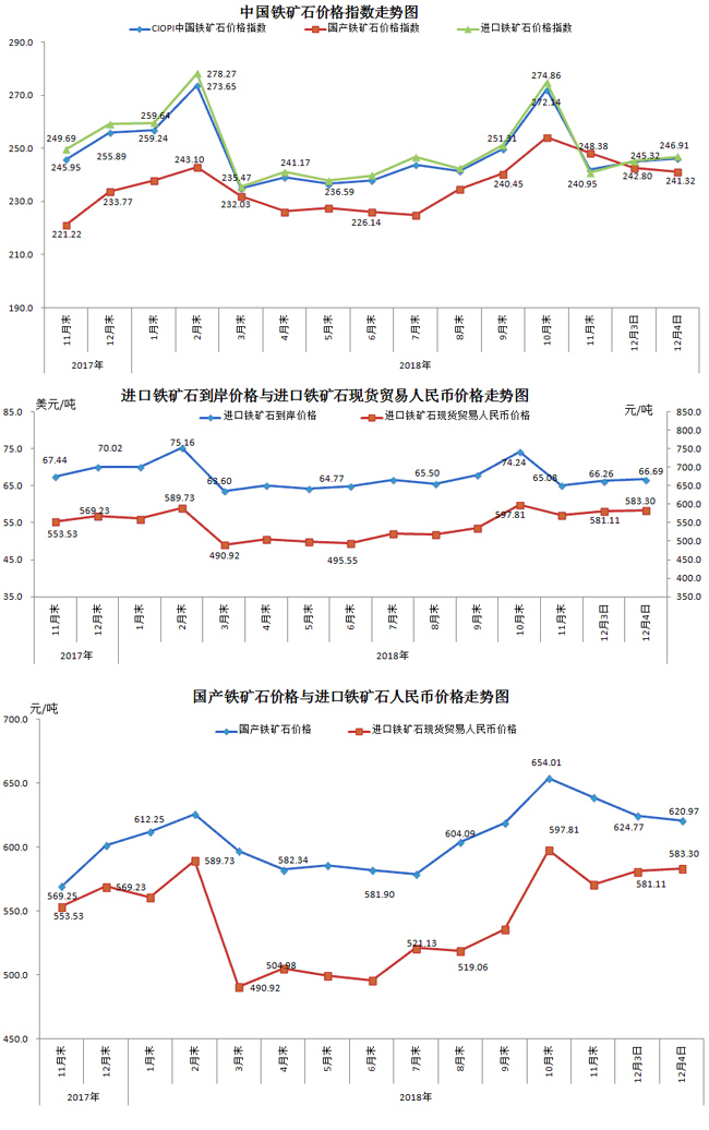 12月4日,現貨貿易進口鐵礦石62%品位幹基粉礦人民幣含稅價格為583.30元/噸,環比每噸上升2.19元,升幅為0.38%,當月平均價格為582.21元/噸。