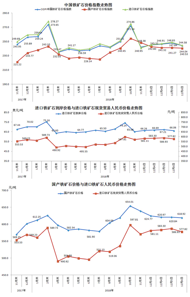 12月6日,中國鐵礦石價格指數(CIOPI)244.04點,環比下降3.80點,降幅為1.53%。其中:國產鐵礦石價格指數為240.53點,環比下降0.74點,降幅為0.31%;進口鐵礦石價格指數為244.58點,環比下降4.26點,降幅為1.71%。