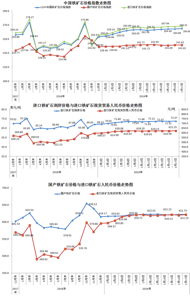 1月17日,中國鐵礦石價格指數(CIOPI)264.80點,環比上升0.51點,升幅為0.19%。其中:國產鐵礦石價格指數為241.62點,環比持平;進口鐵礦石價格指數為268.31點,環比上升0.59點,升幅為0.22%。