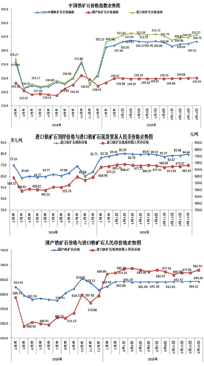 3月14日,中國鐵礦石價格指數(CIOPI)303.35點,環比上升3.62點,升幅為1.21%。其中:國產鐵礦石價格指數為250.39點,環比上升0.07點,升幅為0.03%;進口鐵礦石價格指數為313.37點,環比上升4.29點,升幅為1.39%。