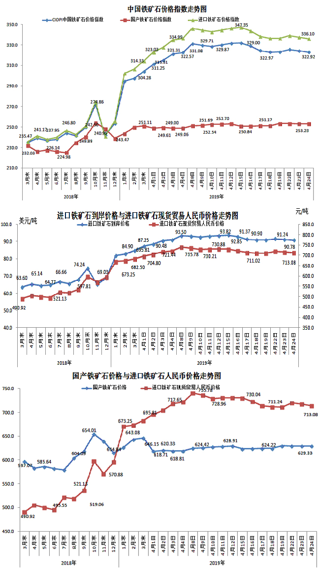 4月24日,中國鐵礦石價格指數(CIOPI)322.92點,環比下降1.43點,降幅為0.44%。其中:國產鐵礦石價格指數為253.23點,環比持平;進口鐵礦石價格指數為336.10點,環比下降1.70點,降幅為0.50%。