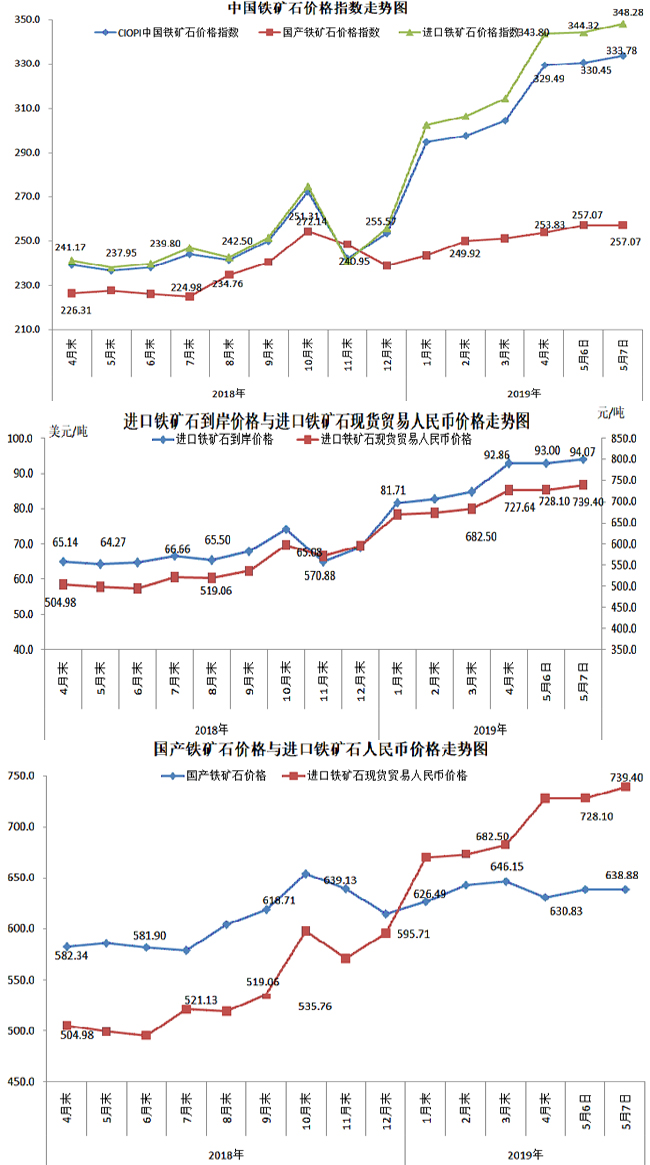 5月7日,現貨貿易進口鐵礦石62%品位幹基粉礦人民幣含稅價格為739.40元/噸,環比每噸上升11.30元,升幅為1.55%,當月平均價格為733.75元/噸。