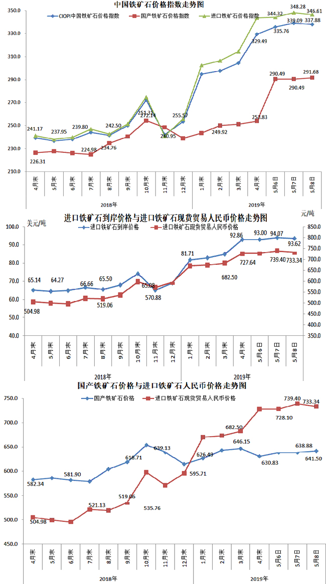 5月8日,中國鐵礦石價格指數(CIOPI)337.88點,環比下降1.21點,降幅為0.36%。其中:國產鐵礦石價格指數為291.68點,環比上升1.19點,升幅為0.41%;進口鐵礦石價格指數為346.61點,環比下降1.67點,降幅為0.48%。