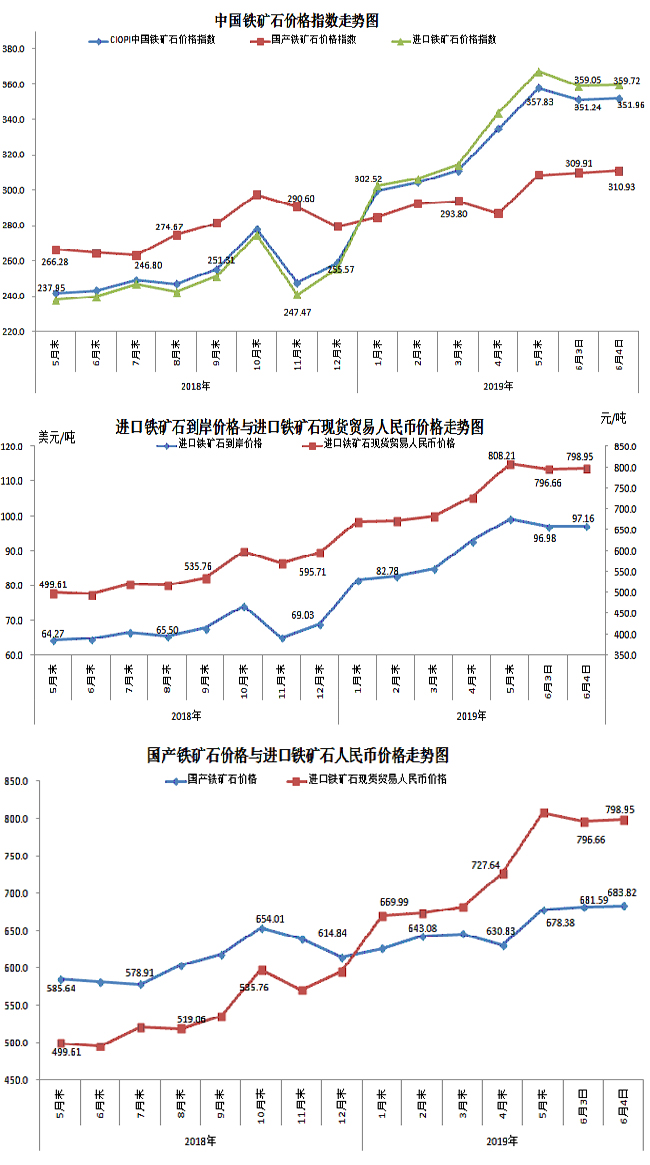 6月4日,中國鐵礦石價格指數(CIOPI)351.96點,環比上升0.72點,升幅為0.21%。其中:國產鐵礦石價格指數為310.93點,環比上升1.02點,升幅為0.33%;進口鐵礦石價格指數為359.72點,環比上升0.67點,升幅為0.19%。