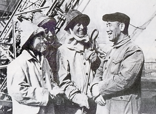 圖為孟泰(右一)在與一線職工進行技術交流。