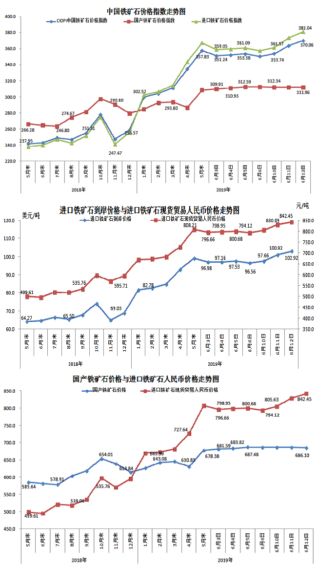 6月12日,中國鐵礦石價格指數(CIOPI)370.06點,環比上升6.20點,升幅為1.70%。其中:國產鐵礦石價格指數為311.96點,環比下降0.18點,降幅為0.06%;進口鐵礦石價格指數為381.04點,環比上升7.40點,升幅為1.98%。