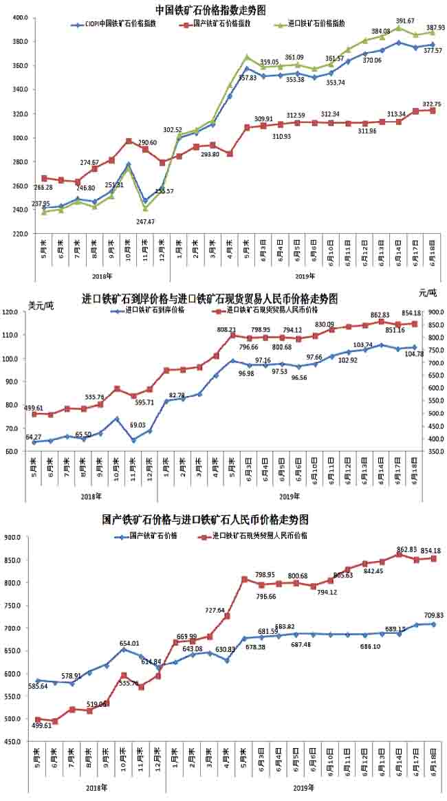 6月18日,中國鐵礦石價格指數(CIOPI)377.57點,環比上升2.04點,升幅為0.54%。其中:國產鐵礦石價格指數為322.75點,環比上升0.52點,升幅為0.16%;進口鐵礦石價格指數為387.93點,環比上升2.33點,升幅為0.60%。