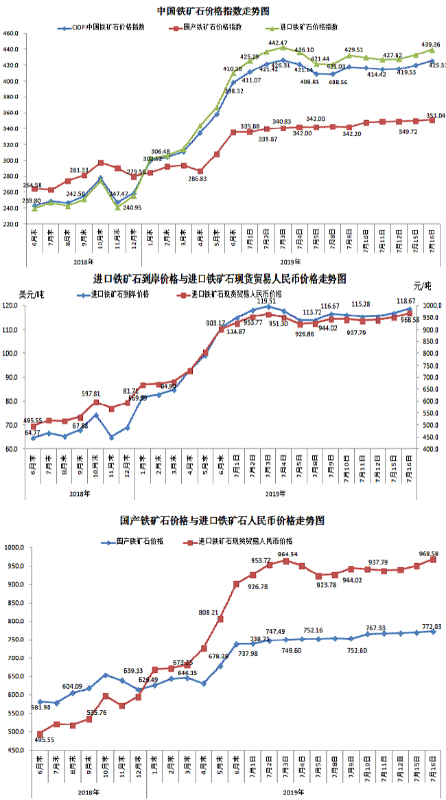 7月16日,中國鐵礦石價格指數(CIOPI)425.31點,環比上升5.78點,升幅為1.38%。其中:國產鐵礦石價格指數為351.04點,環比上升1.31點,升幅為0.38%;進口鐵礦石價格指數為439.36點,環比上升6.63點,升幅為1.53%。
