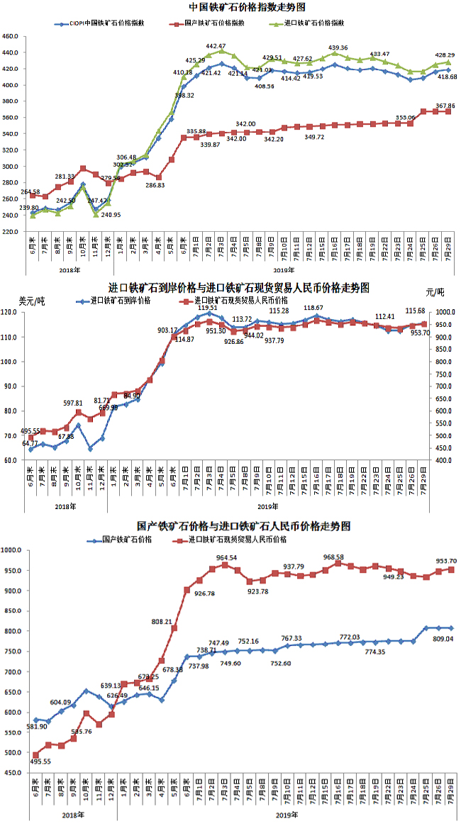 7月29日,中國鐵礦石價格指數(CIOPI)418.68點,環比上升2.66點,升幅為0.64%。其中:國產鐵礦石價格指數為367.86點,環比上升0.11點,升幅為0.03%;進口鐵礦石價格指數為428.29點,環比上升3.15點,升幅為0.74%。