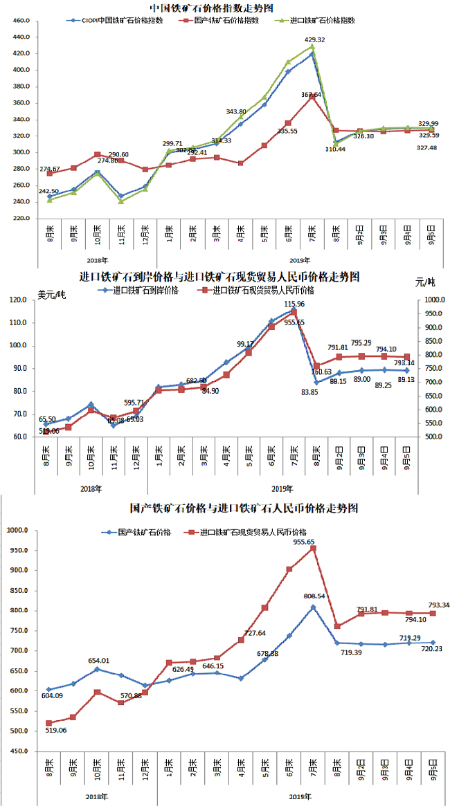 9月5日,中國鐵礦石價格指數(CIOPI)329.59點,環比下降0.31點,降幅為0.09%。其中:國產鐵礦石價格指數為327.48點,環比上升0.43點,升幅為0.13%;進口鐵礦石價格指數為329.99點,環比下降0.44點,降幅為0.13%。