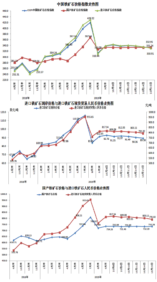 10月15日,中國鐵礦石價格指數(CIOPI)331.24點,環比下降3.05點,降幅為0.91%。其中:國產鐵礦石價格指數為332.95點,環比上升0.03點,升幅為0.01%;進口鐵礦石價格指數為330.91點,環比下降3.63點,降幅為1.08%。