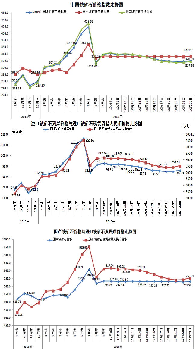 10月23日,中國鐵礦石價格指數(CIOPI)320.01點,環比上升2.33點,升幅為0.73%。其中:國產鐵礦石價格指數為332.61點,環比上升1.35點,升幅為0.41%;進口鐵礦石價格指數為317.62點,環比上升2.52點,升幅為0.80%。