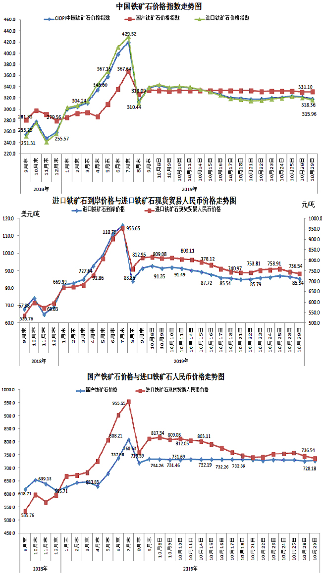 10月29日,中國鐵礦石價格指數(CIOPI)318.36點,環比下降3.48點,降幅為1.08%。其中:國產鐵礦石價格指數為331.10點,環比上升0.60點,升幅為0.18%;進口鐵礦石價格指數為315.96點,環比下降4.26點,降幅為1.33%。