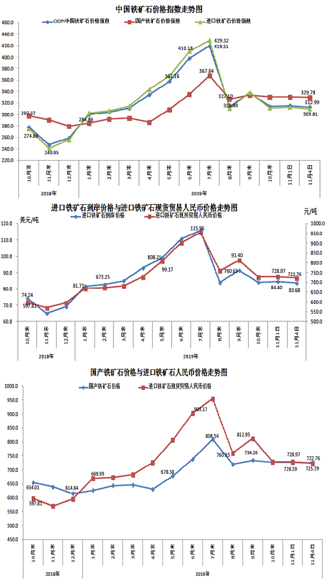 11月4日,中國鐵礦石價格指數(CIOPI)312.99點,環比下降2.34點,降幅為0.74%。其中:國產鐵礦石價格指數為329.78點,環比下降0.59點,降幅為0.18%;進口鐵礦石價格指數為309.81點,環比下降2.67點,降幅為0.85%。