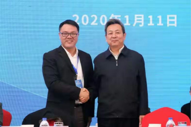 圖為2020年輪值會長沈彬與2019年輪值會長高祥明握手