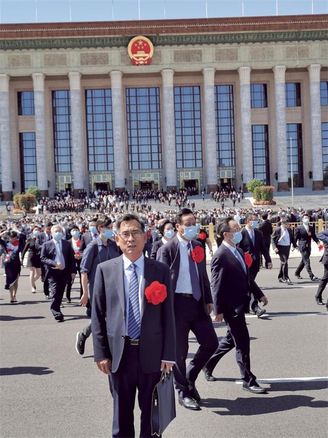 圖為安鋼魏兆勇在人民大會堂前留念。 (安鋼 供圖)